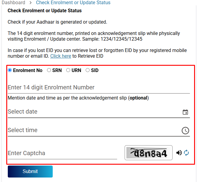 - Now fill in all the details like 14 digital enrolment printed on acknowledgement slip, select date, time and captcha or either 8 digital URN number or S followed by 27 digital number.